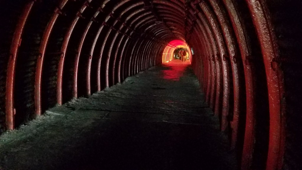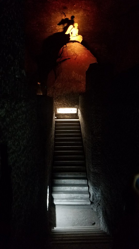 Para comenzar, como ya les había comentado el descenso por los túneles cuenta con obras que simbolizan el Vía Crucis de Jesucristo. Mayormente estas obras se dan en la forma de cruces que representan distintas etapas ya sea de la vida de Jesús como de esa caminata al Calvario. El «espectáculo», por así decirlo, se complementa con música sacra y luces tenues de diferentes colores y tonalidades.