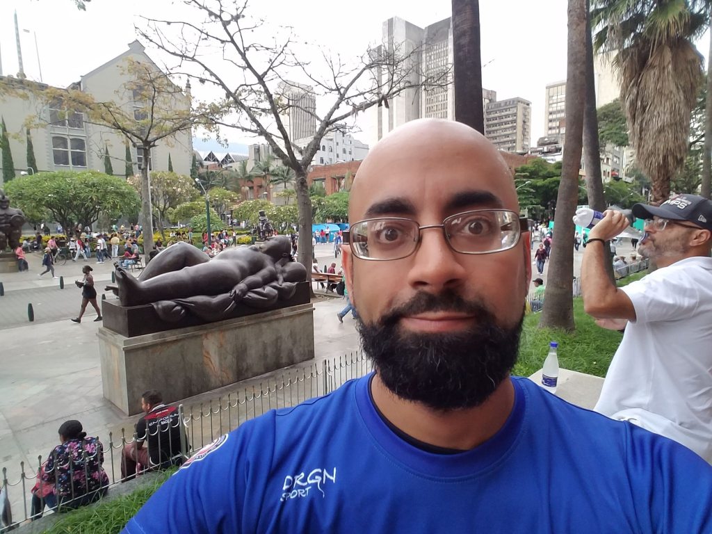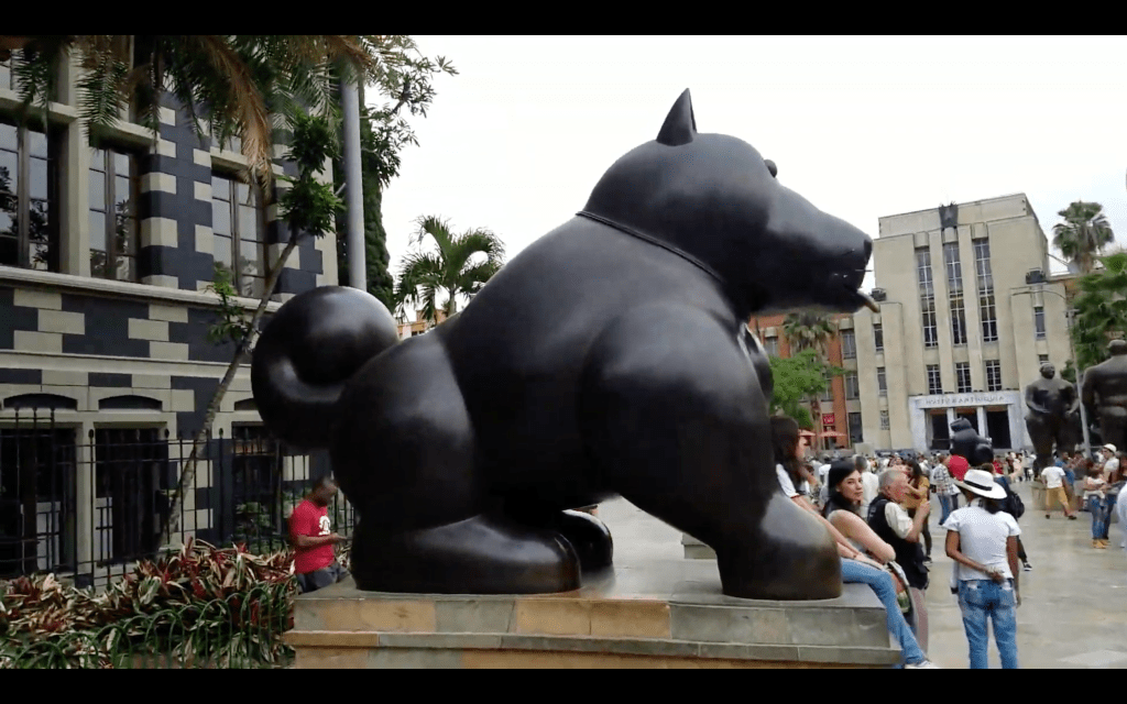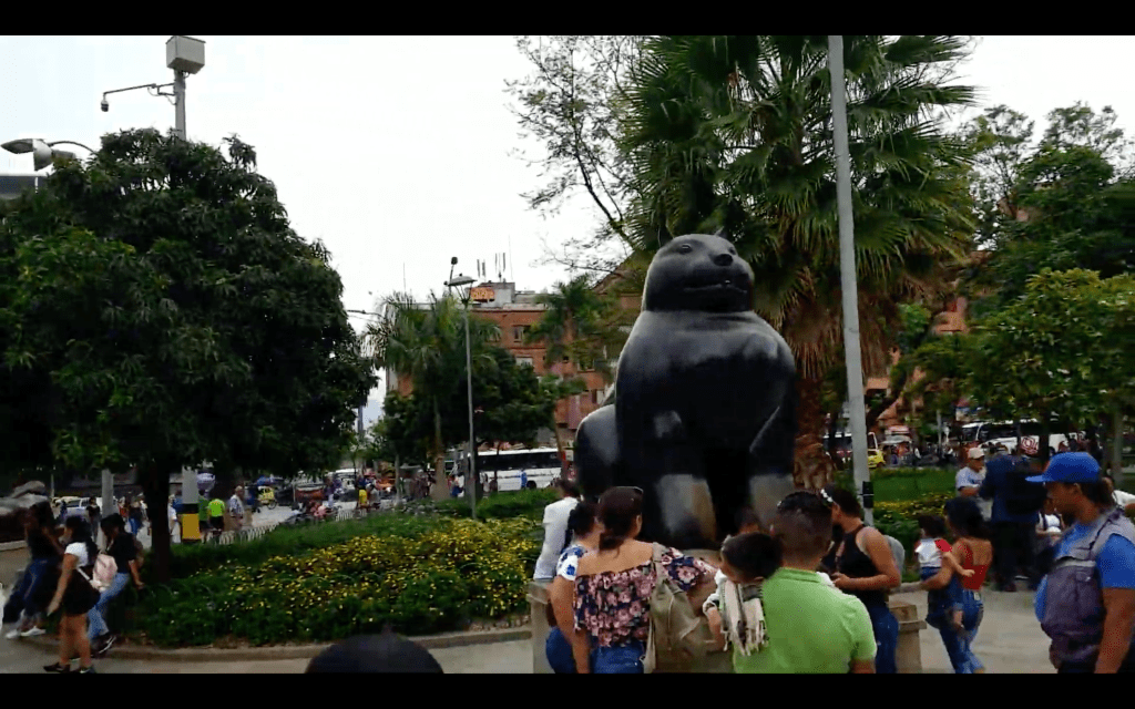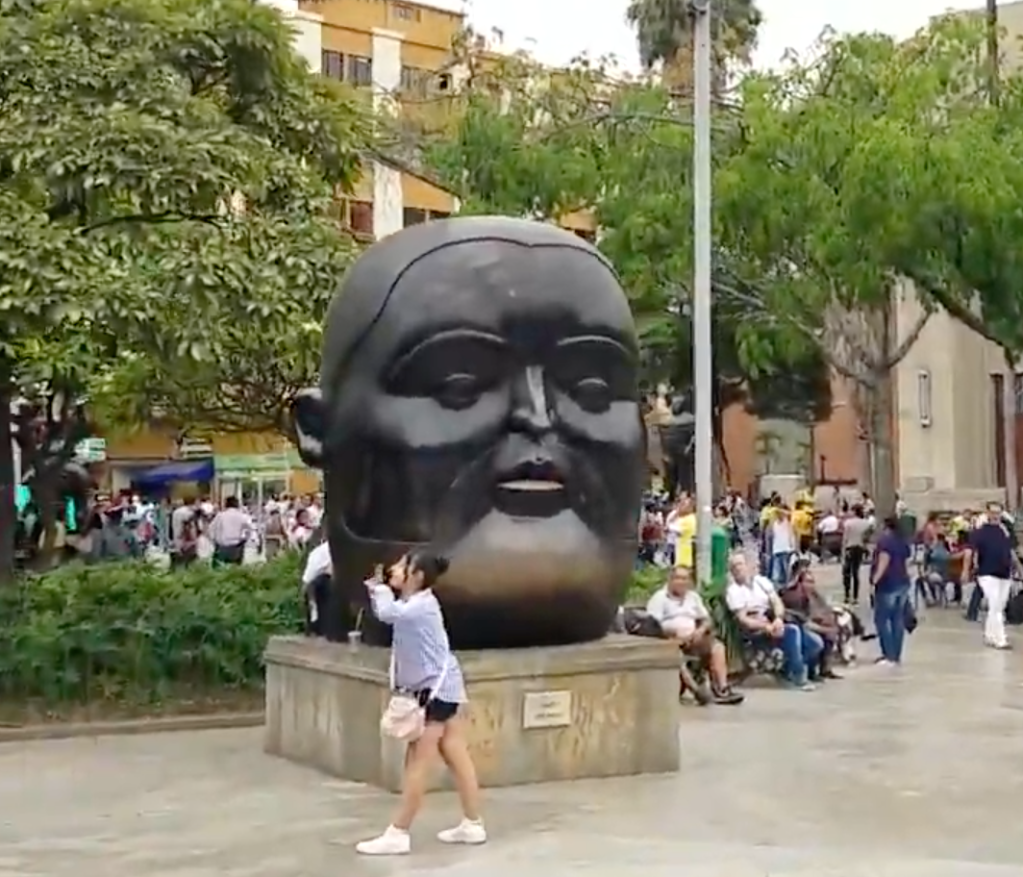 Encima nuestro se hallaba una vía elevada del famoso metro de Medellín, apuntando en la misma dirección hacia donde nos dirigíamos. Las columnas que le sostenían estaban cubiertas de plantas y flores, pero no por falta de mantenimiento o descuido; su presencia era ornamental, y cumplían con fusionarse de manera natural con los árboles que se hallaban más adelante. Ese «más adelante» lo alcanzamos luego de cruzar la calle, pasando por un grupito de policías con chalecos amarillos que charlaban amenamente, y un señor con gorra de los Mets de Nueva York al que le faltaba la mano izquierda, mientras sostenía con la derecha lo que parecían ser panfletos informativos de la plaza. Detrás del señor ya se podían ver las primeras gorditas de bronce que hacían de este lugar uno especial.