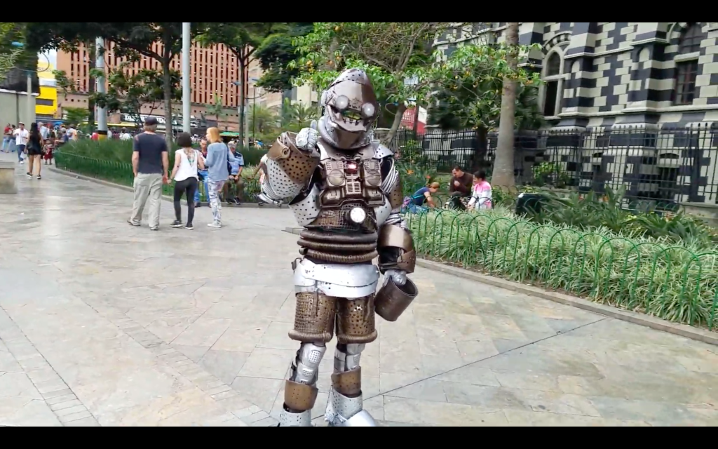 Como lugar de multitudes que es, la Plaza Botero atrae todo tipo de personajes, como el «robot» de abajo: