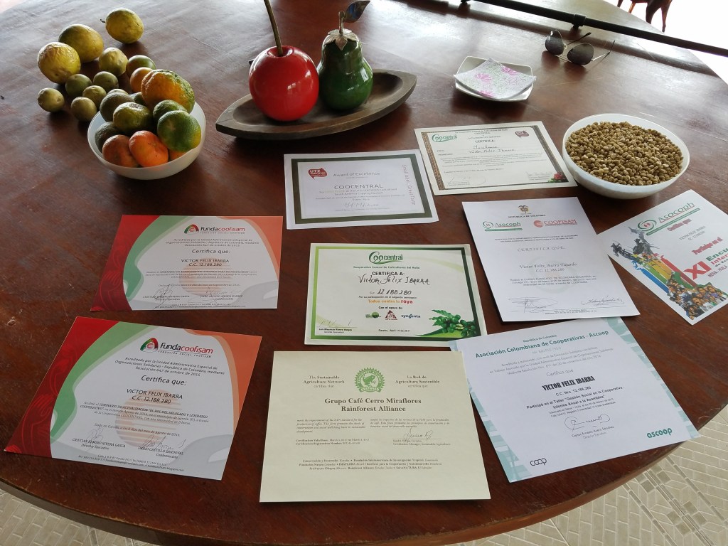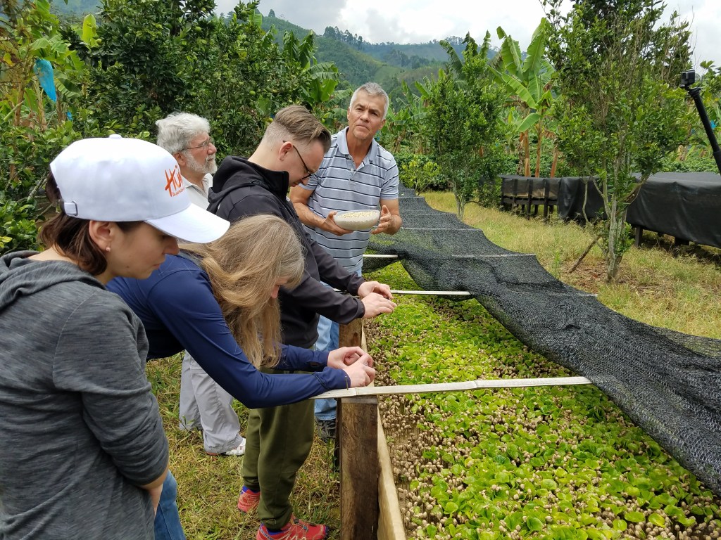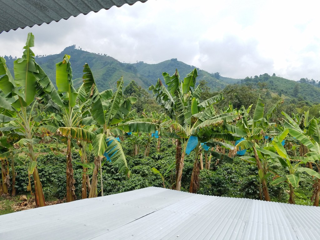 Terminado el almuerzo y el show, nuestro próximo destino fue la finca Lusitania, una de las más galardonadas de Colombia. Nos atendió muy amablemente el Sr. Víctor Ibarra, quien nos mostró entre otras cosas el cómo utilizan otras plantas (en este caso, plátanos) para cubrir con sombra a las plantas de café y de esa manera regular la temperatura en la que se desarrolla el grano. A su vez aprovechan para producir plátanos también.