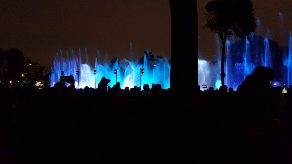 Hablemos ahora del Circuito Mágico del Agua. Se trata de un parque o plaza que contiene varias fuentes de aguas con diferentes shows. Estos comienzan luego de las 7:00PM, y es una experiencia simpática. No diré que es «imperdible», pero si tiene el tiempo dese una vuelta. Hay muchísima gente, así que no pierda de vista a sus compañeros. También hace frío (recuerden que en Lima nunca sale el sol, y esto es de noche, más hay agua por todos lados), así que lleven una buena chaqueta o abrigo si es friolento. También hay varios puestos de comida en las afueras que me tentaron, pero como todo visitante extranjero si es que va a consumir hágalo con moderación y siempre tenga a la mano medicinas para el estómago en caso de.