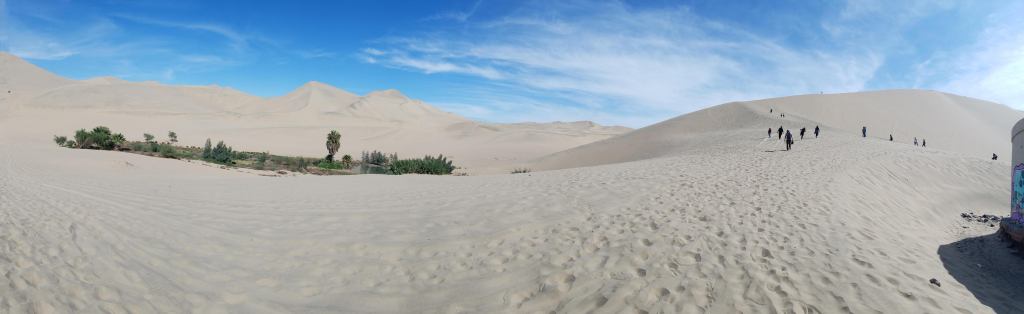 Al otro día partimos hacia el Oasis de la Huacachina. Hoy en día es una pequeña ciudad turística con una población permanente de alrededor de 120 personas, construida alrededor de la laguna que le da su nombre. Es un lugar muy exótico, como de película, en donde se practica además el sandboarding y los buggies. Sin embargo, nosotros no practicamos ninguna aquí, ya que la compañía que nos daría los servicios trabaja en otra región. Qué tanto control hay en la Huacachina en cuanto a la seguridad en los buggies, lo desconozco. El sandboarding lo pueden practicar aquí sin problemas pues es cuestión de alquilar una tabla, subir una duna, y lanzarse. Si mal no recuerdo (y me disculpan por tener que abusar de la memoria aquí) el costo del alquiler es de unos tres soles, que equivale a menos de un dólar americano.