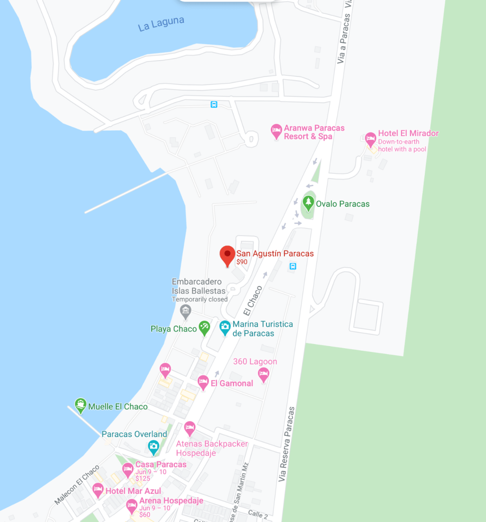 El San Agustín Paracas se supone es un hotel humilde y económico (en especial cuando se compara con su lujoso vecino el Aranwa) pero la realidad es que es un hotel muy bonito, por dentro y por fuera, y está excelentemente ubicado frente al mar, y anexo a un «strip» comercial de tienditas en donde pueden conseguir souvenirs de confección local. Aquí aproveché para comprar guantes y un gorrito para el frío, que no sólo me harían falta para Cusco, sino que me hacían falta en esos momentos para este lugar. Recuerden, el desierto es frío de noche. Para complicar el asunto, por falta de espacio en el bus solo llevamos equipaje de mano (el resto del equipaje lo dejamos en el hotel de Lima, al cual volveríamos), y empaqué tan pobremente para esta noche que no tenía ningún abrigo. El abrigo no hace falta en la habitación, claro, pero si quieren salir y explorar un poco, lo necesitarán o sufrirán como yo.