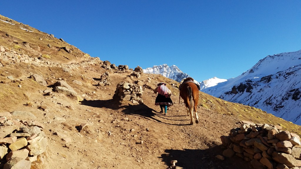 Tardan aproximadamente una hora en llegar a caballo al punto de las fotos. El caballo no puede llevarlos todo el camino, esos últimos doscientos metros más o menos los tienen que subir a pie. Parecerá poco, pero en esa altura – y en este punto hablamos de 5200 metros sobre el nivel del mar – recorrer ese último tramo supone un vía crucis que incluso vi personas que dieron la vuelta y regresaron sin completarlo. Ese primer párrafo de este blog, ese corazón que latía como si estuviera corriendo a toda velocidad en una cuesta empinada, esa presión que me subió como la espuma, esa fatiga propia de alguien que ha corrido un maratón, eso es lo que se siente subir esa colina.