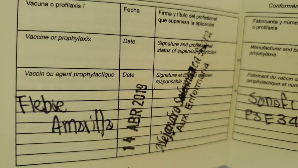 Habiendo averiguado esto, en mi último viaje a Colombia, en abril de 2019, decidí aprovechar y ponerme la vacuna. Hubo un cierto elemento de riesgo puesto que Bogotá era la primera pata de mi viaje, y siempre cabe la posibilidad de tener efectos secundarios que me dañaran el resto de mi estadía en Colombia. Afortunadamente no tuve efectos de ningún tipo.