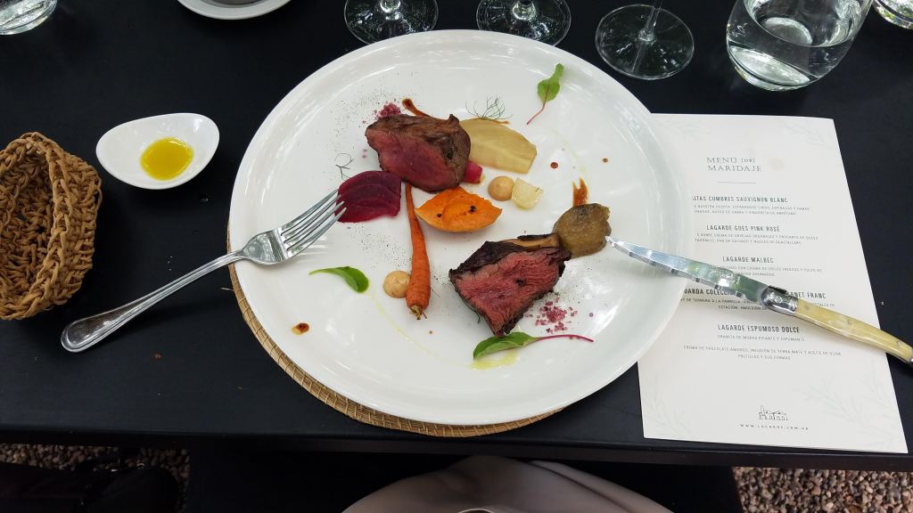Al igual que Espacio Trapiche, el maridaje en Lagarde es importante. Muchos de nosotros estamos acostumbrados a que nos sirvan platos con mucha comida, con una bebida de acompañamiento, y a devorar se ha dicho. Este no es el caso de las bodegas, o de cualquier establecimiento que sirva múltiples pasos. Cada plato contiene solo la suficiente comida para maridar con la copa de vino correspondiente antes de moverse al siguiente. En otras palabras, el punto no es únicamente comer bien y llenarse la barriga; el punto es vivir una experiencia gastronómica en donde el paladar es asaltado por varios vinos complementados por los alimentos mejor indicados. El protagonista, lógicamente, no es la comida, sino los vinos; pero la comida no es menos importante en este baile, siendo la pareja que te acompaña en un tango apasionado, una salsa muy movida, o un vals elegante. No es lo mismo bailar solo que sintiendo el calor de esa pareja junto a ti mientras se mueven a la par como si fueran uno solo. El maridaje consta de escoger la mejor pareja en cada baile, para que no hayan pisotones ni faltas de sincronía. Para que puedan disfrutarse cada baile como se debe.