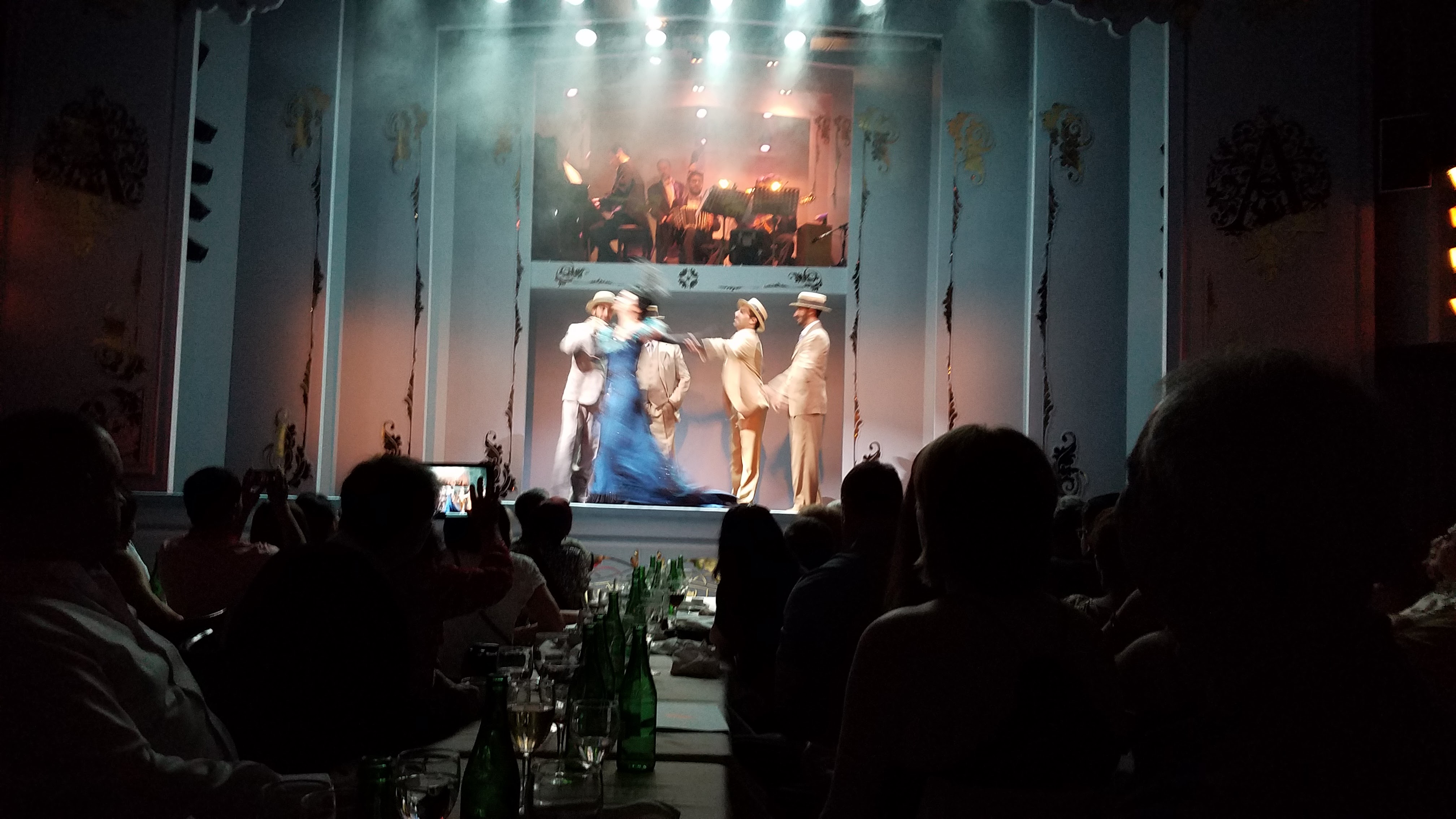 Café de los Angelitos fue el primero de los shows que pude ver. Es un local y escenario relativamente pequeños, como pueden apreciar en la foto de arriba y el .gif de abajo. También es una puesta en escena bastante sencilla, con la orquesta en la parte superior del escenario, y los bailarines/actores en la tarima. Los primeros quince a veinte minutos intercalan bailes de tango con piezas puramente orquestales, incluyendo versiones especiales de canciones populares tales como El Día Que Me Quieras, parte del musical Evita, y hasta el tema de la Pantera Rosa. Este último, por extraño que parezca, fue mi favorito tanto por el arreglo musical como la coreografía del baile.
