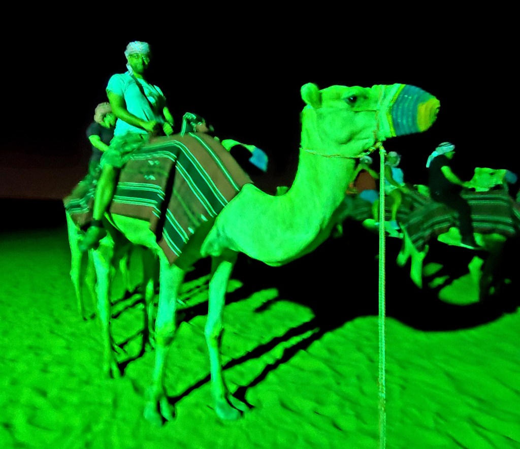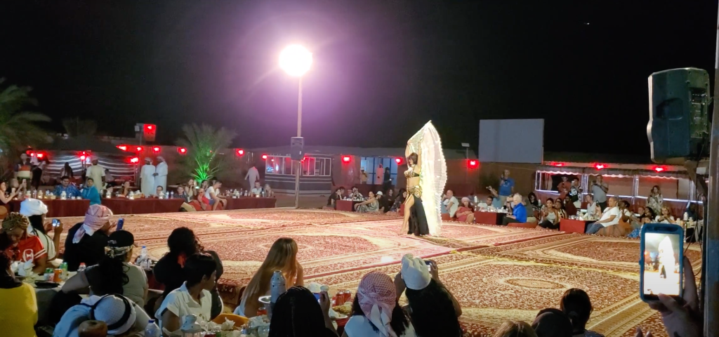 Lo siguiente es una cena y show, aunque no al mismo estilo de experiencias parecidas en Panamá o Buenos Aires. Primero que nada, tanto la cena como el show es al aire libre, en medio del desierto, y como entremés pueden montar a camello y tomarse fotos con ellos.