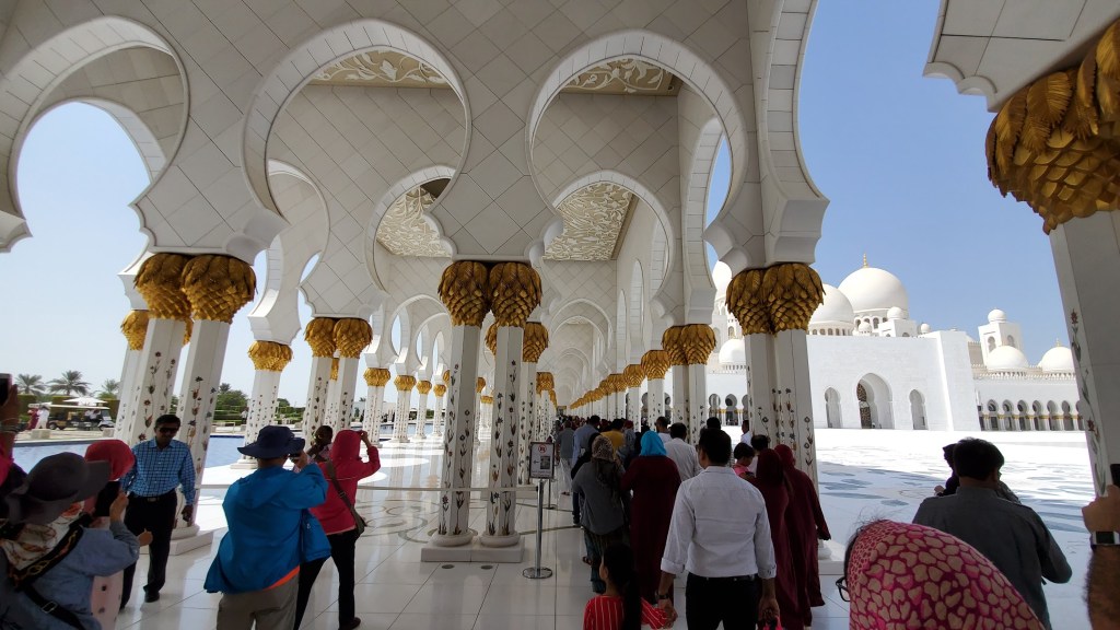 Poco después de este punto me dijeron que no podía grabar video en esa área. No recuerdo el porqué de esa área en particular, pero adentro de la mezquita grabé sin problemas, incluso con el estabilizador de la cámara. Aunque tenía la bandera y no me la quitaron como sucedió en el Burj Khalifa, era más que obvio que sería una falta de respeto desplegarla adentro. A veces es cuestión de usar el sentido común, cosa que le hizo falta a la cantante Rihanna cuando visitó la mezquita hace años y se tomó fotos en unas poses que lógicamente no iban a sentar bien. Fue expulsada (amablemente, claro) de la mezquita.