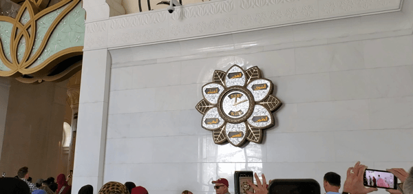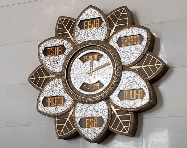 El reloj de arriba indica las horas de rezo islámicas: Fajr, Dhuhr, Asr, Maghrib, e Isha. Estas cinco son obligatorias – excepto en casos especiales. La sexta – Shoroq o Shurooq – indica la salida del sol, que es cuando termina el tiempo de Fajr. En estos momentos no se debe rezar.