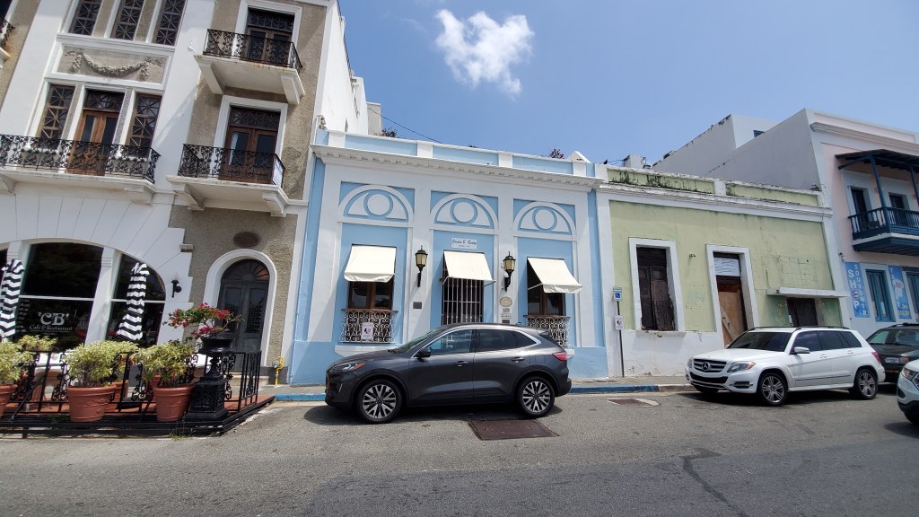 Final y felizmente me uní al grupo y comenzamos el recorrido a pie. El punto de encuentro no fue uno aleatorio tampoco. El tour consta de en cierta forma seguir la vida de don Ricardo Alegría a través de varios lugares que formaron parte integral de ella. De manera muy conveniente la primera parada estaba al cruzar la calle en el extremo opuesto a donde está el Teatro Tapia que se ve arriba, en una casita donde hace muchas décadas, de hecho hace más de un siglo, los padres de don Ricardo vivían y en donde el pequeño Ricardo se crió.