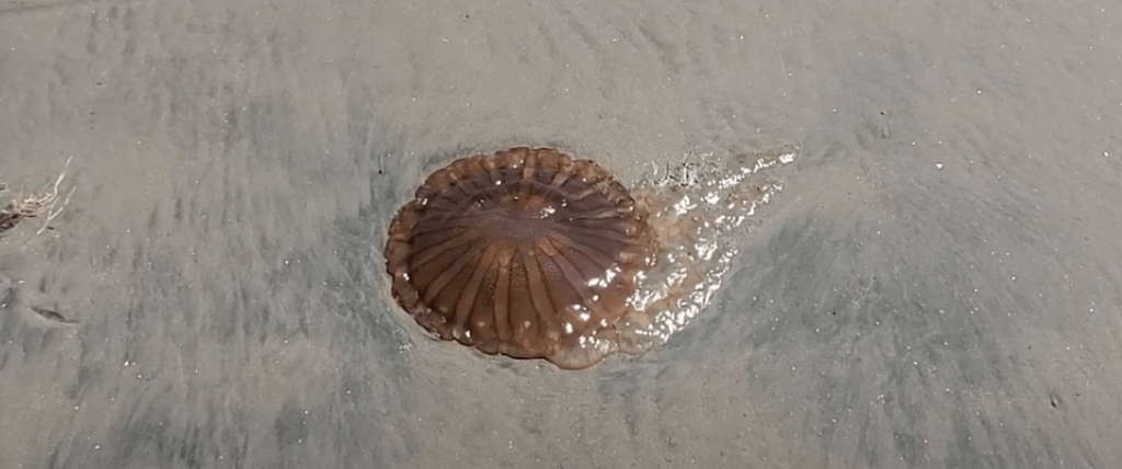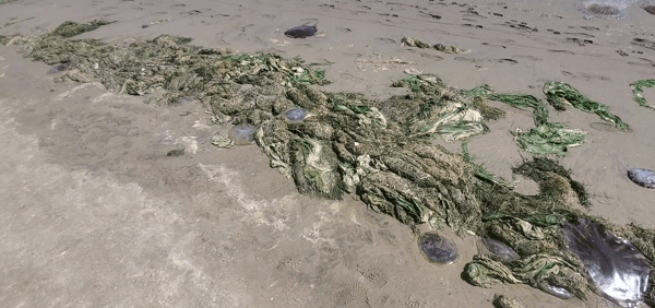 No, no las algas. Las medusas. Sucede que – aparentemente debido al cambio climático – las medusas están muriendo a montones y muchas vienen a parar a esta playa, lo que provoca un espectáculo a la vez deprimente e interesante. También la descomposición provoca ciertos olores que no son agradables, lógicamente.