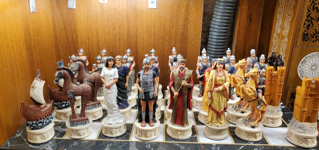 Yo no soy de gastar comprando souvenirs o artículos caros en viajes, pero me parece ya haber mencionado anteriormente en este blog cómo me gusta coleccionar tableros exóticos de los diferentes países a los que visito. Lo hice por primera vez en Guatemala, un tablero que hoy en día no tengo idea en donde está. Todos los demás que he comprado sí los tengo aún guardados, tanto de Perú, Egipto, Jordania, y Turquía. Los más interesantes los compré aquí, en la tienda al lado del 40B en el Bazaar de las Especias: cruzados europeos contra musulmanes, troyanos contra griegos, macedonios contra persas., etc.