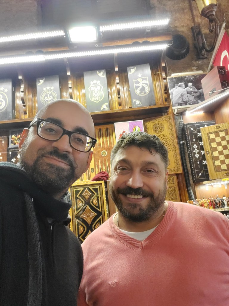 En la tienda al lado del 40B estaba el mismo chico que me había atendido la primera vez, Aydın, el cual luego de unos momentos se acordó de mi. Conversamos un rato, hablamos de otros tableros, regateamos un poco, y terminé comprando dos más. También hice algo que rara vez hago por mi cuenta, y es tomarme una foto viajera con un completo extraño al que conocí de manera efímera. Quizás es que ya sentía que nos estábamos haciendo amigos.