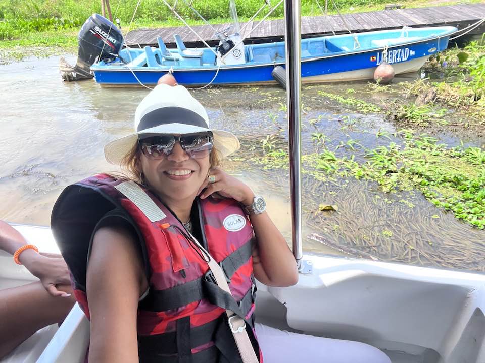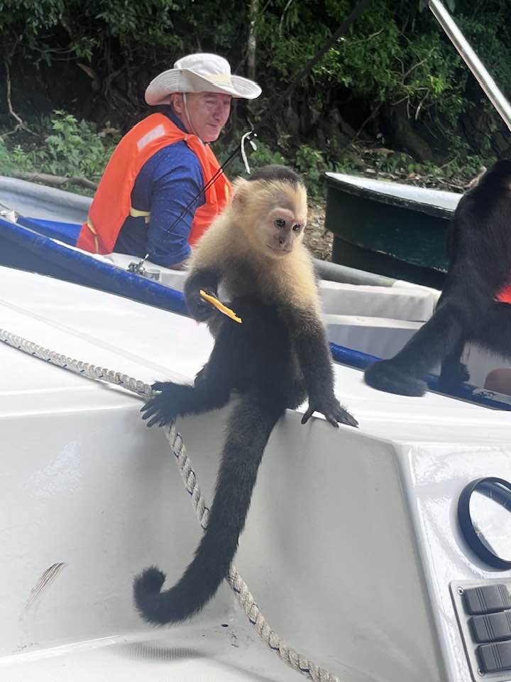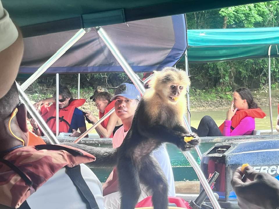 Hoy me fui para la Selva Gamboa, en tour. Comenzamos con un recorrido en lancha por el lago Gatum, que es el que alimenta de agua las esclusas del Canal de Panamá. Tiene pequeñas islas que están habitadas por monos, perezosos y aves. En una de las islas tuve la oportunidad de alimentar un mono capuchino, y fue una experiencia emocionante.